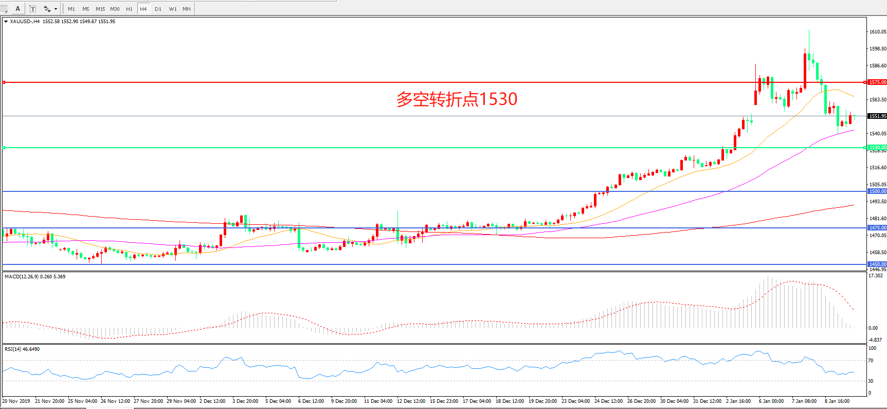 周四(1月9日),美国总统特朗普在讲话中表现温和,声称美国准备好与所有寻求和平的人一起拥抱和平,国务院副总理、中美全面经济对话中方牵头人刘鹤将于13日-15日与美方签署第一阶段经贸协议,中东地区局势转变与中美贸易谈判进展缓和了市场中的避险情绪,金价一度回落逾5美元,最终收报1552.62美元/盎司。