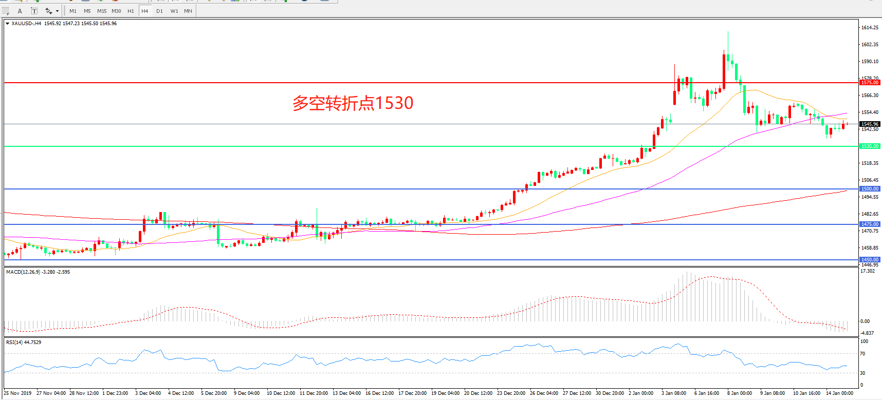 周二(1月14日),全球贸易局势的乐观情绪给金价带来下行压力,现货黄金先跌后涨,展现出较强韧性,收报1547.39美元/盎司。期待已久的中美贸易协议即将签署,提振了市场情绪,近期的获利回吐行情也让金价“超买”的形势有所缓解,中期来看,金价的走势依然偏多。英国脱欧、特朗普弹劾案和缘政治方面的消息都将成为市场上的潜在”炸弹”。