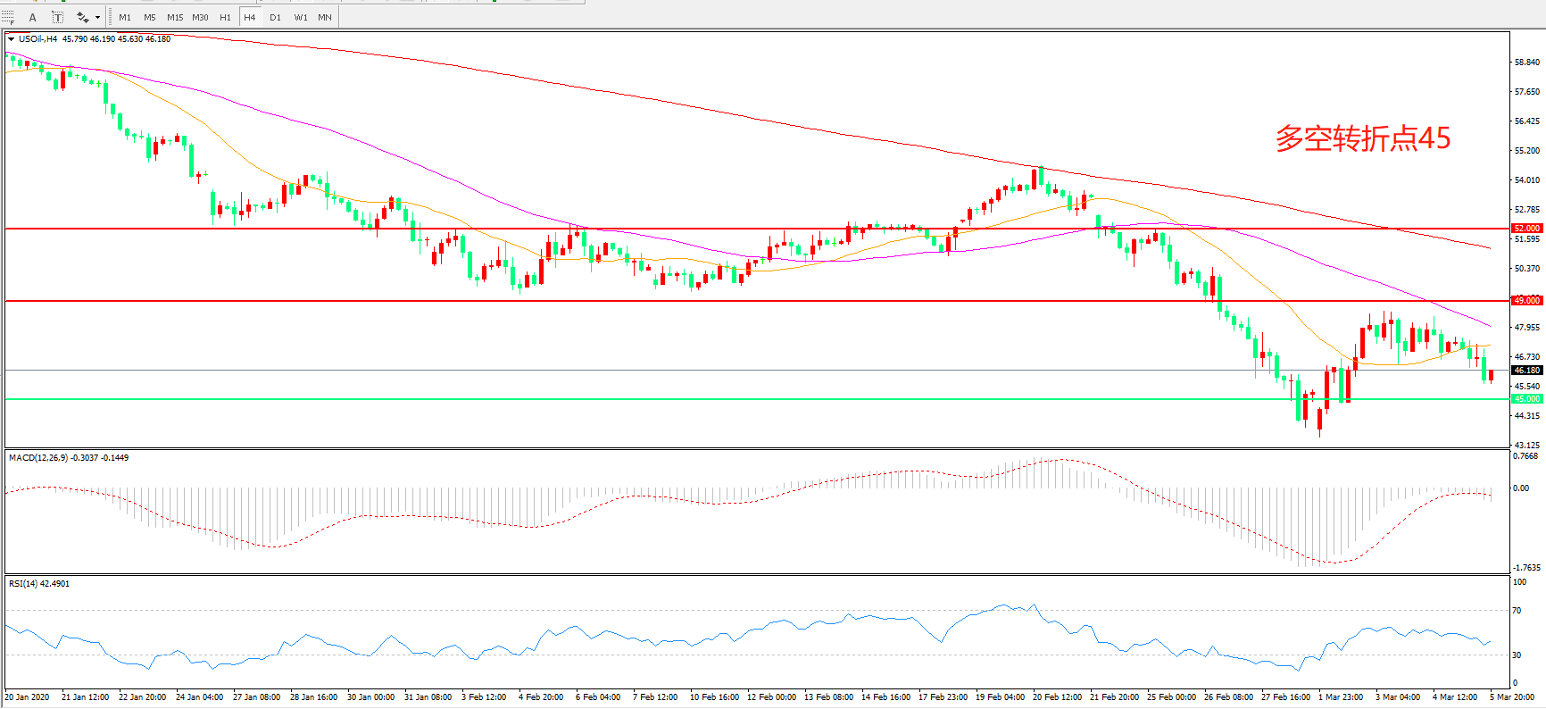 4小时图看,美油延续震荡下行,55周期均线成为上方阻力,整体表现低迷, MACD绿柱减少,RSI指标走平,重点关注45美元一线得失。