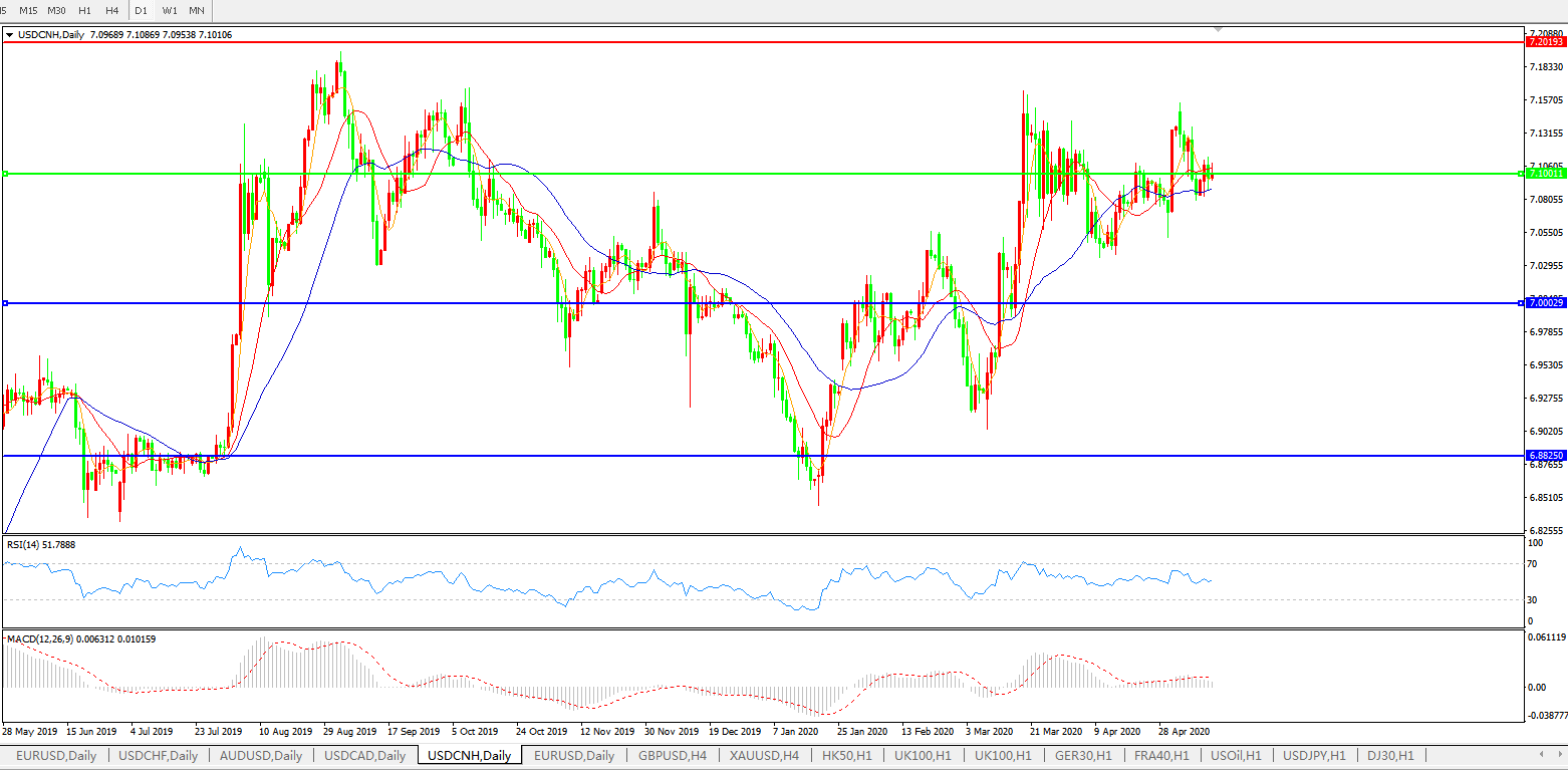 技术面简析:日图均线延续交缠无明显方向,汇价持续在7.10关口盘整,MACD小幅走升但量能缩量,RSI整理中走平,预计短期汇价或将进一步整理,关注7.10关口攻守。