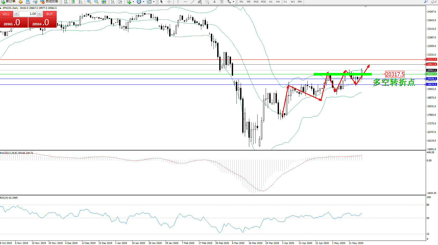 日经225指数5月18日(周一)收盘上涨89.53点,涨幅0.45%,报20127.00点。日本第一季度季调后实际国内生产总值(GDP)季率初值下降0.9%,预期下降1.1%,前值下降1.8%。日本政府表示,日本第一季度GDP标志着日本GDP连续第二个季度陷入收缩。日本低迷的经济增长前景可能在一定程度上限制日元上行空间。受疫苗研发乐观前景的报道,市场风险偏好回暖,美国股市飙升至3月初以来的最高水平,验性新冠疫苗研究的初步结果显示良好前景,提振了经济有望加快重启步伐的预期。