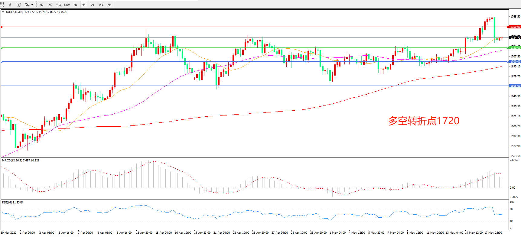 周一(5月18日),受新冠病毒疫苗消息的刺激,金融市场短线大幅波动,黄金遭遇获利了结打压,高台跳水逾38美元,收报1733.17美元/盎司。亚盘时段,鲍威尔的最新言论似乎在暗示美联储可能加强货币政策刺激,而黄金作为对抗贬值和通胀的工具,无疑会来巨大利好。