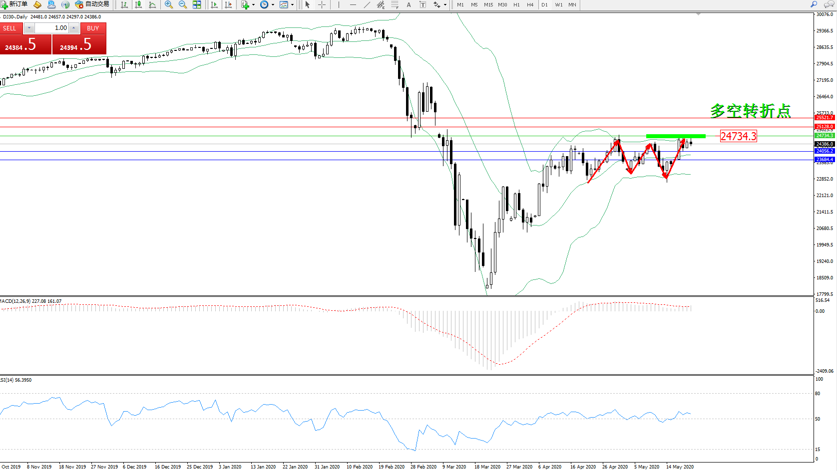 道琼斯指数5月21日(周四)收盘下跌101.80点,跌幅0.41%,报24474.12点。上周又有数百万美国人申请失业救济,疫情造成的混乱引发了第二波裁员,预示着5月份又将出现令人震惊的失业,显示美国经济复苏仍缓慢,至少劳动市场反应相对缓慢。避险需求有所降温,全球各地复工如火如荼,股市油市等受到大幅提振。疫情导致的美元流动性危机已经结束,美联储将经受住进一步的美元需求,但长期前景仍笼罩着不确定性。未来几个季度,随着经济的重新启动,除了估值之外,政治、地缘政治和财政动态也可能对美元走势产生影响,仍需关注美国大选对美元的影响,美元的短、中和长期前景,指出美联储不但是美国的中央银行,也扮演着全球金融体系的央行角色。