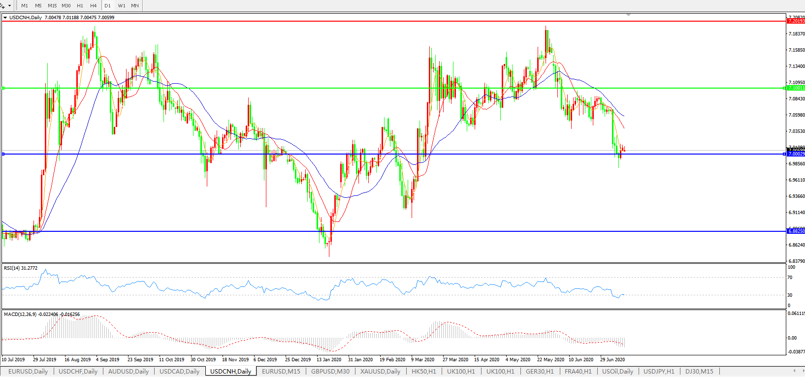 美元兑人民币USDCNH 日线图: