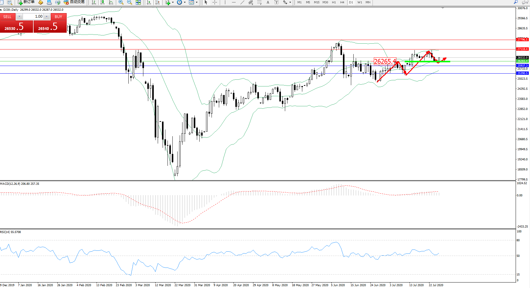 道琼斯指数7月27日(周一)收盘上涨114.90点,涨幅0.43%,报26584.77点。美国股市攀升,科技股领涨,因市场预期美联储本周开会时将加强其鸽派立场。科技股上扬盖过了银行股下跌影响。全球对抗冠状病毒的挫折可能会推动美联储主席鲍威尔周三暗示利率将在更长时间内维持在近零水平。投资者将关注美联储是否会暗示将增加购买较长期债券,以及未来是否会实施收益率曲线控制。美元正在失去桂冠,人们对美联储将继续暗示准备在更长时间内采取更多行动寄予很高的希望,且美国经济的复苏将不会像欧洲那样一帆风顺.