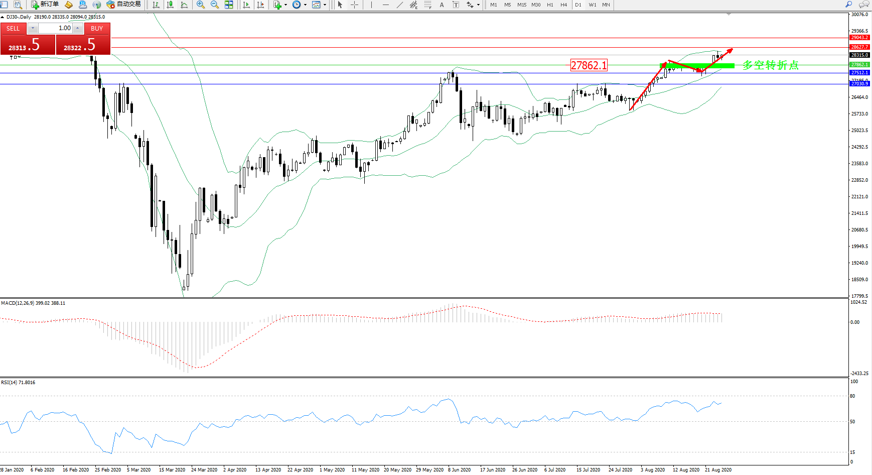道琼斯指数8月26日(周三)收盘上涨83.50点,涨幅0.30%,报28331.92点。美国7月耐用品订单月率大幅攀升11.2%,远高于预期值4.70%和前值7.6%。如今到处充斥着不确定性,包括新冠病毒扩散速度会有多快、还会有多少人死于新冠病毒、以及美国国会是否会推出新一轮的刺激、若真有刺激方案规模会有多大等等。美联储主席鲍威尔发布的讲话比市场预期的更加鸽派;本次鲍威尔讲话内容将会支持暂时性的通胀攀升观点,但整体通胀水平依然较低,不过也不能完全排除出现非常鸽派讲话的意外局面的风险;基本情境预期是,美元将会继续走低,美债实际收益率同样会下降,此外还需关注的是之后美联储其他官员的讲话,尤其是美联储副主席克拉里达在8月31日发布的讲话。