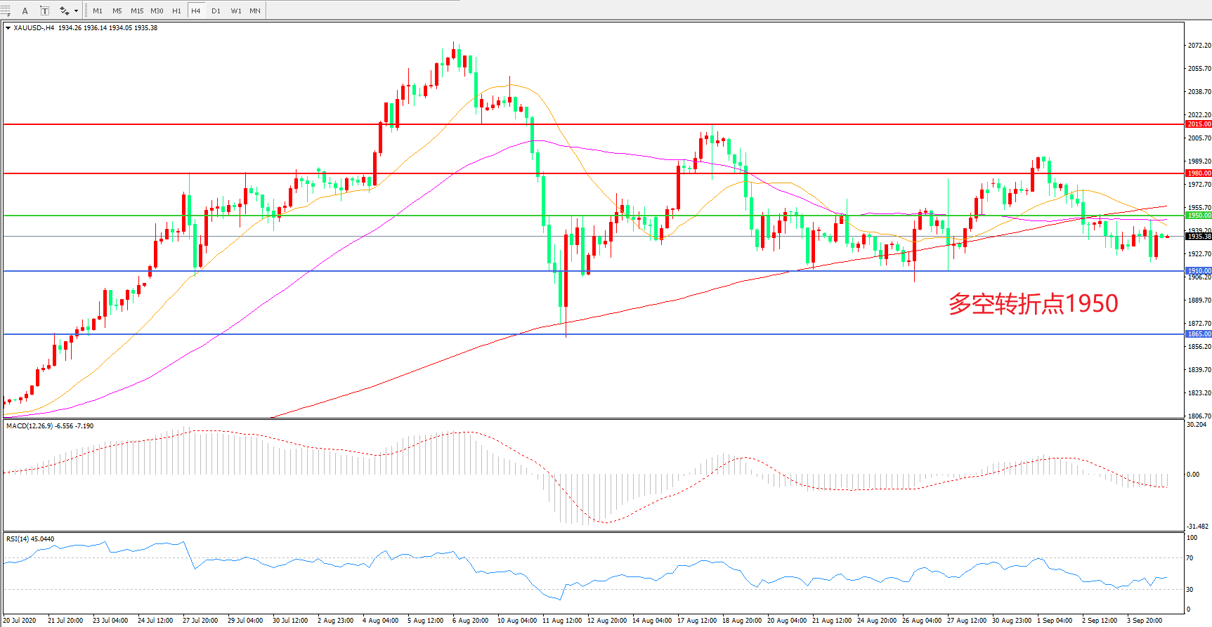 上周五(9月5日),美国8月非农就业数据公布,多项数据好于市场预期,靓丽的数据表现推动美了元回升,金价一度承压下挫,但随后美元重回弱势,现货黄金探底回升,收报1935.93美元/盎司,金价在中线已经面临一定的见顶风险。