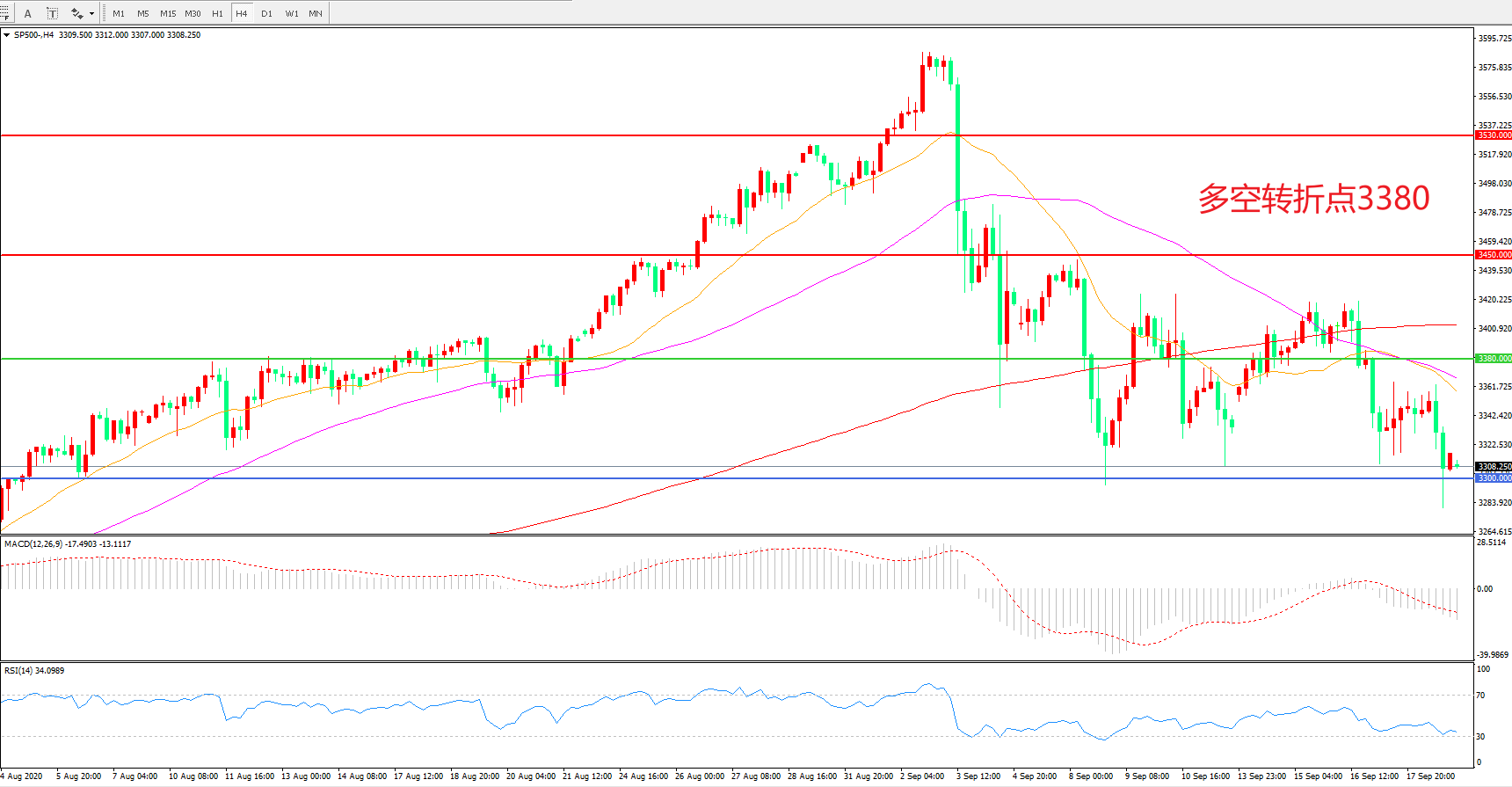 上周五(9月18日),美国财政刺激谈判再陷僵局以及疫苗推出时间出现分歧,投资者继续抛售科技公司股票,标普500大幅下行,收报3316.75点。FAANMG六大科技股连续第三日集体收跌。其中,苹果仅仅用了12个交易日,就从历史最高点暴跌了22%,跌入技术性熊市,市值损失了约5320亿美元。
