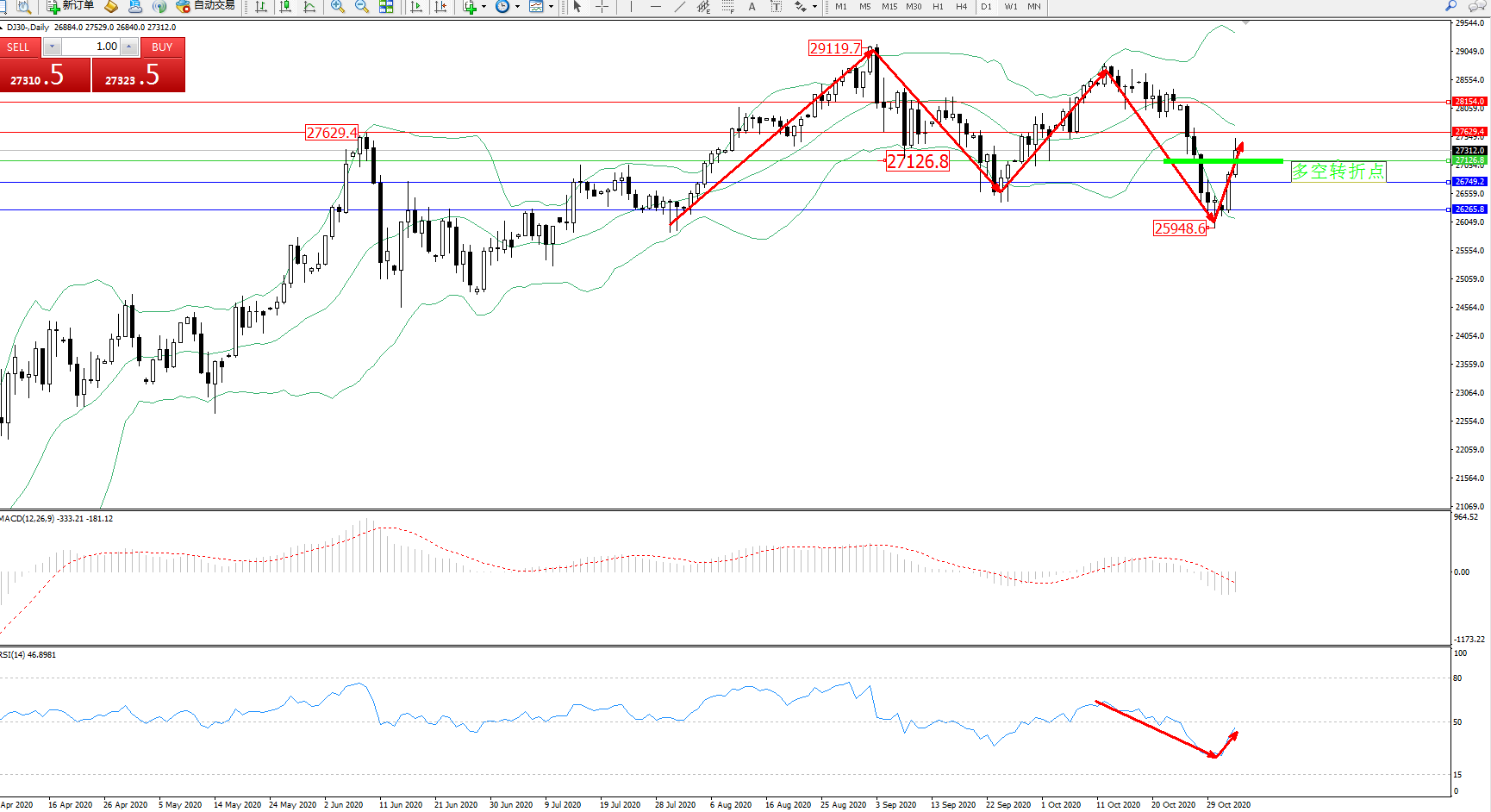 技术点评:高位呈M形态震荡延续布林带指标下轨附近弱势下行,抵达25948附近后得到支撑开始强势反转拉升上扬,即将触及中轨附近节点,布林带指标呈收口走势后有继续下行态势,MACD指标处于0轴线下方空头区域弱势徘徊中,RSI指标处于空头区域弱势整理后开始反转强势拉升,即将触及50均衡线附近节点;
