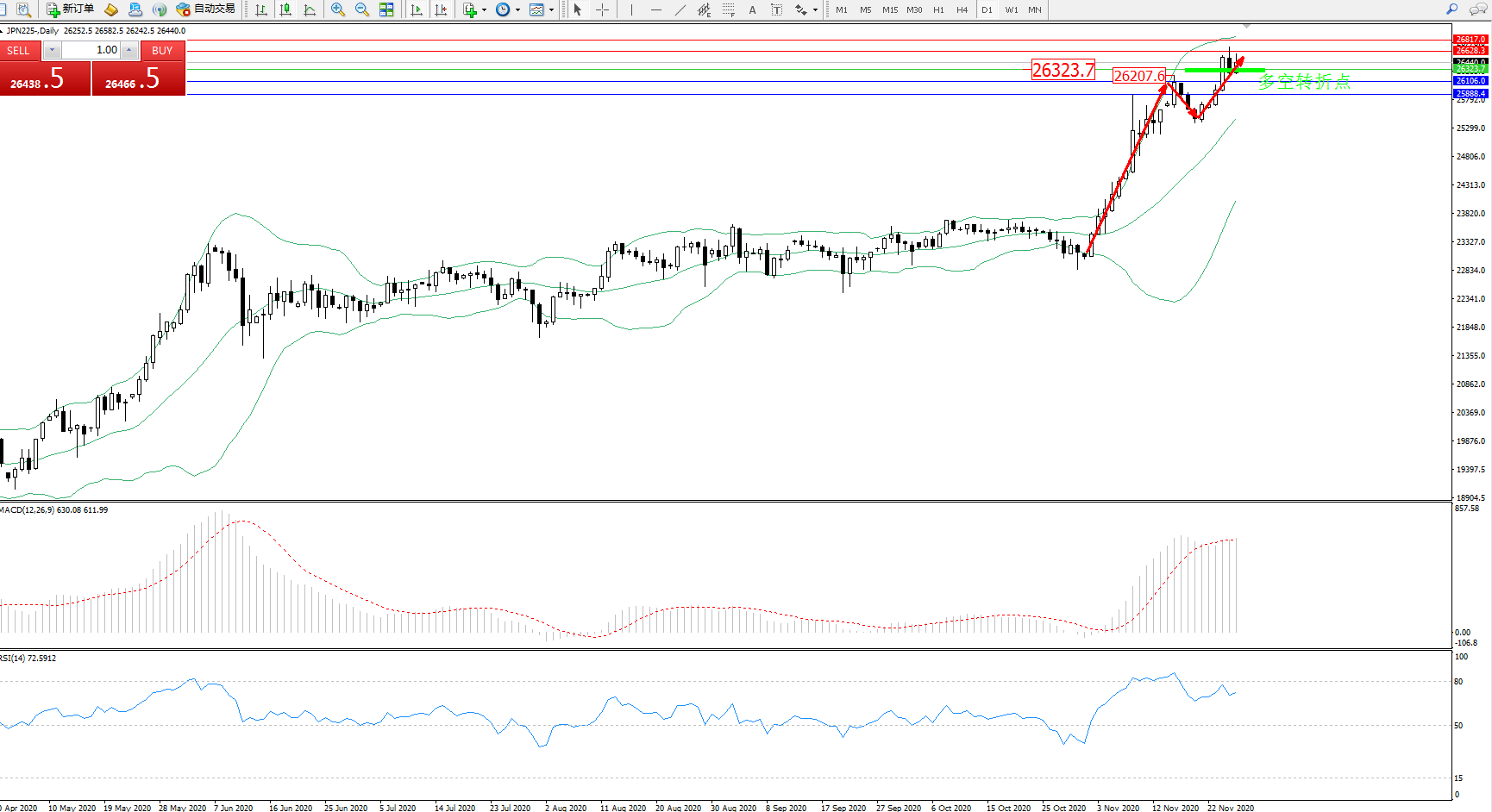 日经225指数11月26日(周四)收盘上涨251.64点,涨幅0.96%,报26548.50点。日本经济再生相西村康稔称,能否在接下来的3周内控制新冠肺炎疫情扩散至关重要,一旦感染继续扩散,政府考虑再次发布紧急状态宣言。日本政府当天举行了疫情对策会议,西村在会后的新闻发布会上称,“无论如何要在接下来的3周内控制住疫情,如果感染继续扩大,疫情级别升至最严重的的4级,政府将考虑再次发布紧急状态宣言”。日本东京新增新冠肺炎确诊病例481例。东京新冠肺炎重症病例从54例上升到60例。在感恩节假期前夕,美国公布不少的数据显示,在这个试图摆脱新冠病毒之害的经济体中,压力和动力交错,痛苦与欢乐参半。