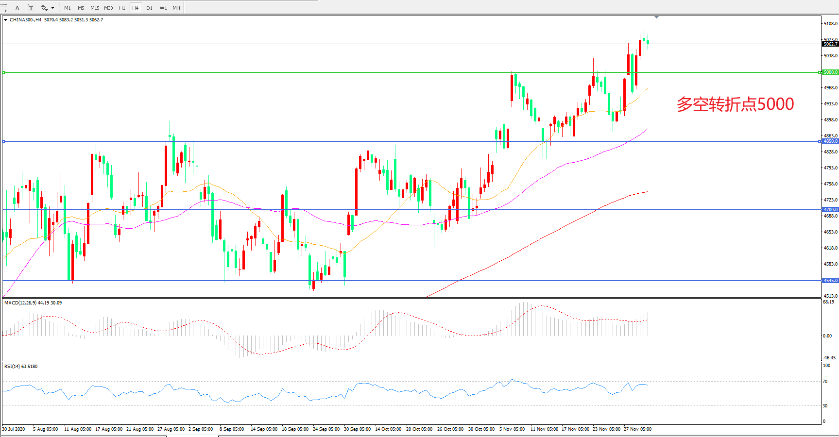 4小时图看,沪深300延续高位震荡,短期走势十分强势,均线系统呈多头排列,5000成为下方支撑,MACD红柱增加,RSI指标向上,日内延续震荡概率较大。