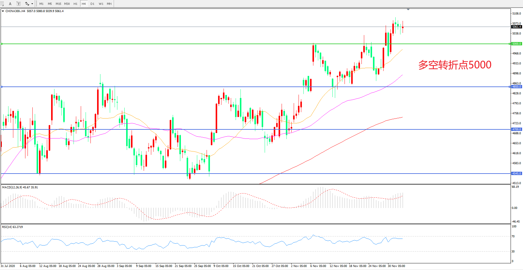 4小时图看,沪深300延续高位震荡,短期涨势有所放缓,但均线系统依然呈多头排列,5000成为下方支撑,MACD红柱增加,RSI指标向上,日内延续震荡概率较大。