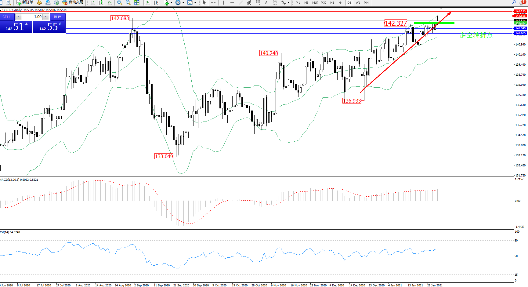 交易策略:142.327上方看涨,目标142.816、143.135