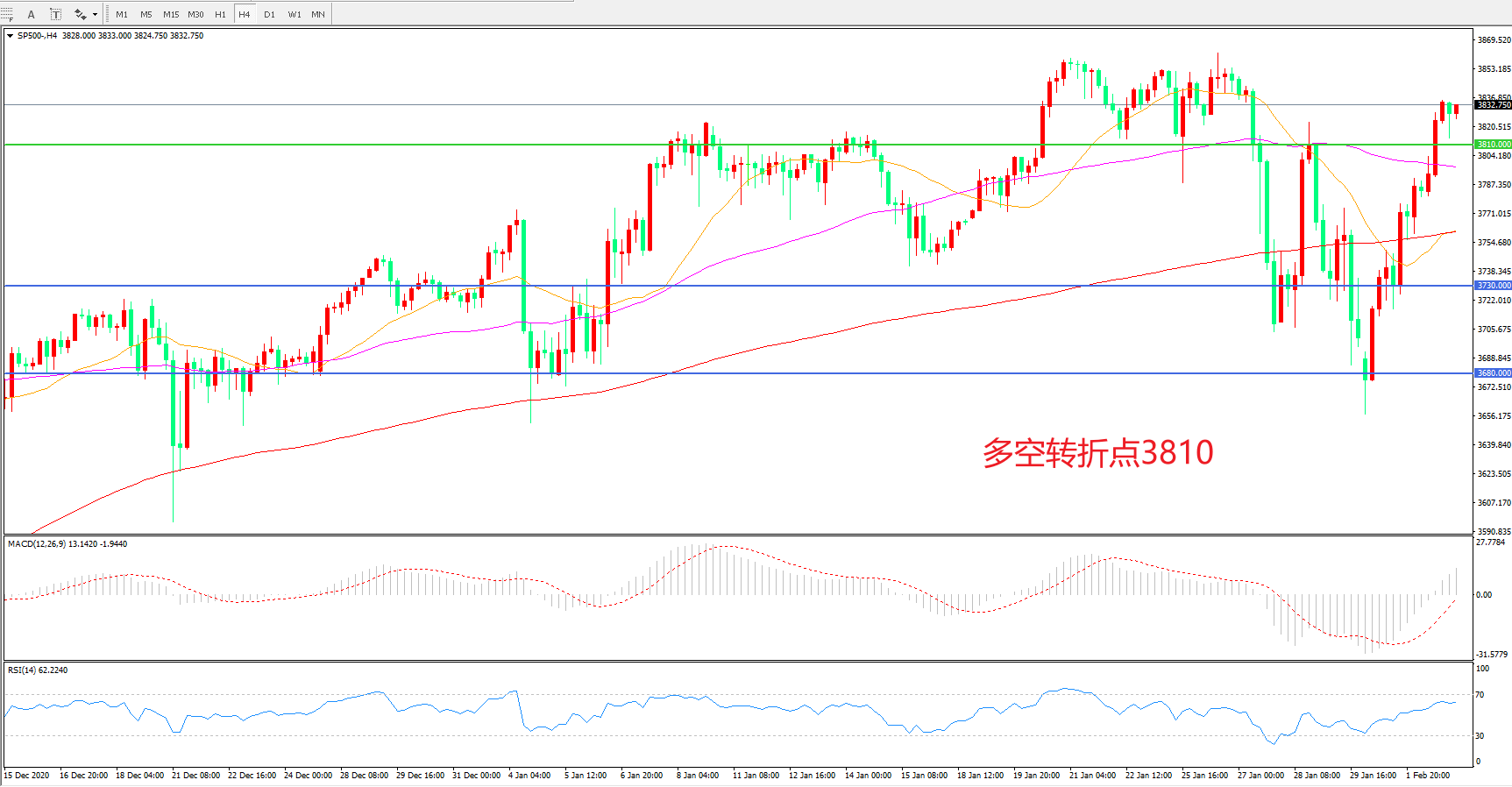 4小时图看,标普500长阳连续拉升,短期走势回暖,3810成为短期多空分水岭,3730成为下方支撑,MACD红柱增加,RSI指标走平,日内延续震荡概率较大。