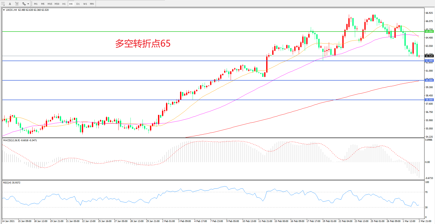 交易策略: 在65.00之下看跌,目标62.00 60.00