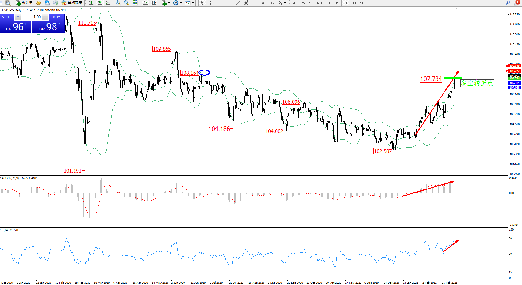 技术点评:多头动力延续布林带指标上轨附近强势拉升上扬态势良好,触及八个月以来高位,前期位置108.164位置近在咫尺破位在即,多头动力尚未有减弱态势,关注109.865附近目标点位,布林带指标呈张口走势态势良好,MACD指标处于多头区域持续震荡上扬走势中,RSI指标处于多头区域维持整理不断向上移动中;