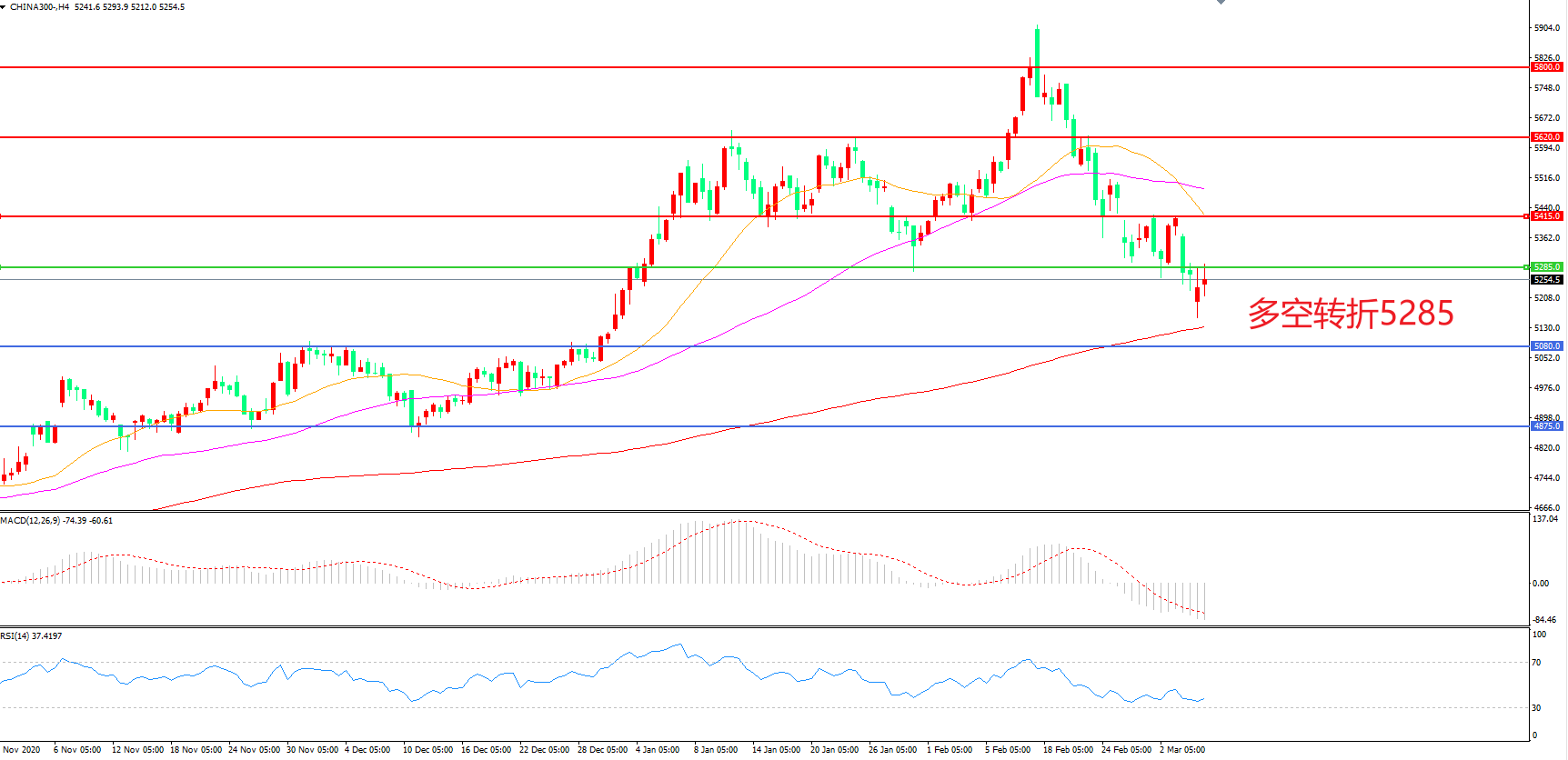 4小时图看,沪深300震荡下行,跌破前期整理区间,整体表现相对低迷,200周期均线形成下方支撑,5285成为上方阻力,MACD绿柱增加,RSI指标走平,日内延续震荡概率较大。