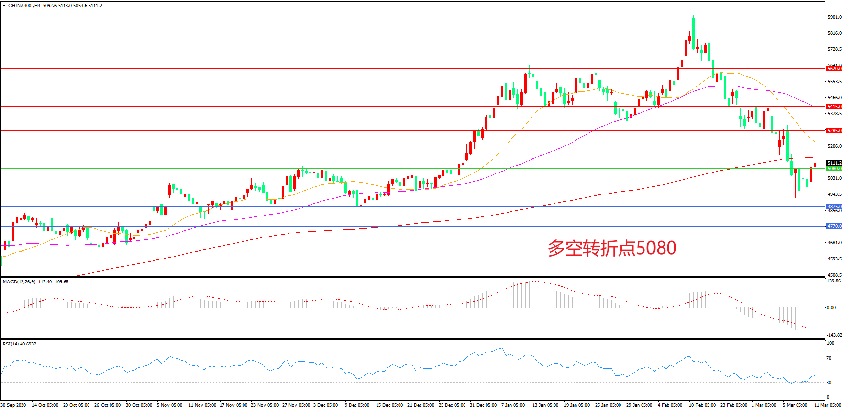 4小时图看,沪深300长阴下破后小幅回升,整体表现有所回暖,200周期成为多空分水岭,MACD绿柱缩短,RSI指标走平,日内延续震荡概率较大。