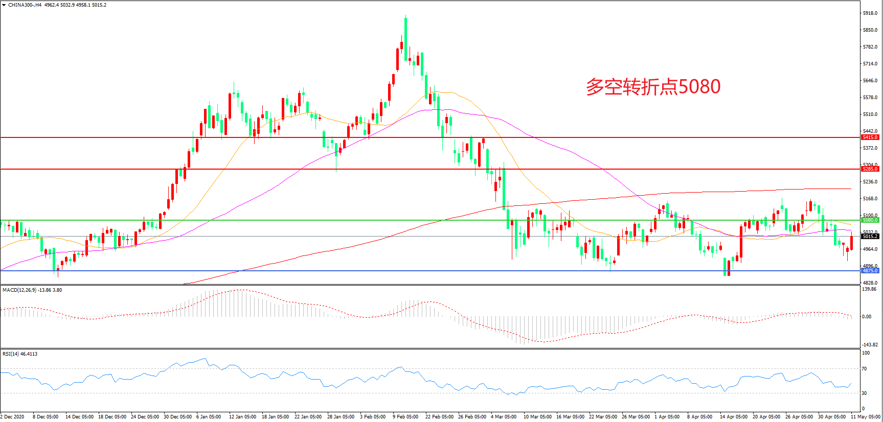 4小时图看,沪深300长阴破位后小幅回调,短期跌势有所缓解,但均线系统形成的阻力依然未能突破,4875成为下方支撑,MACD红柱缩短,RSI指标向上,日内延续震荡概率较大。