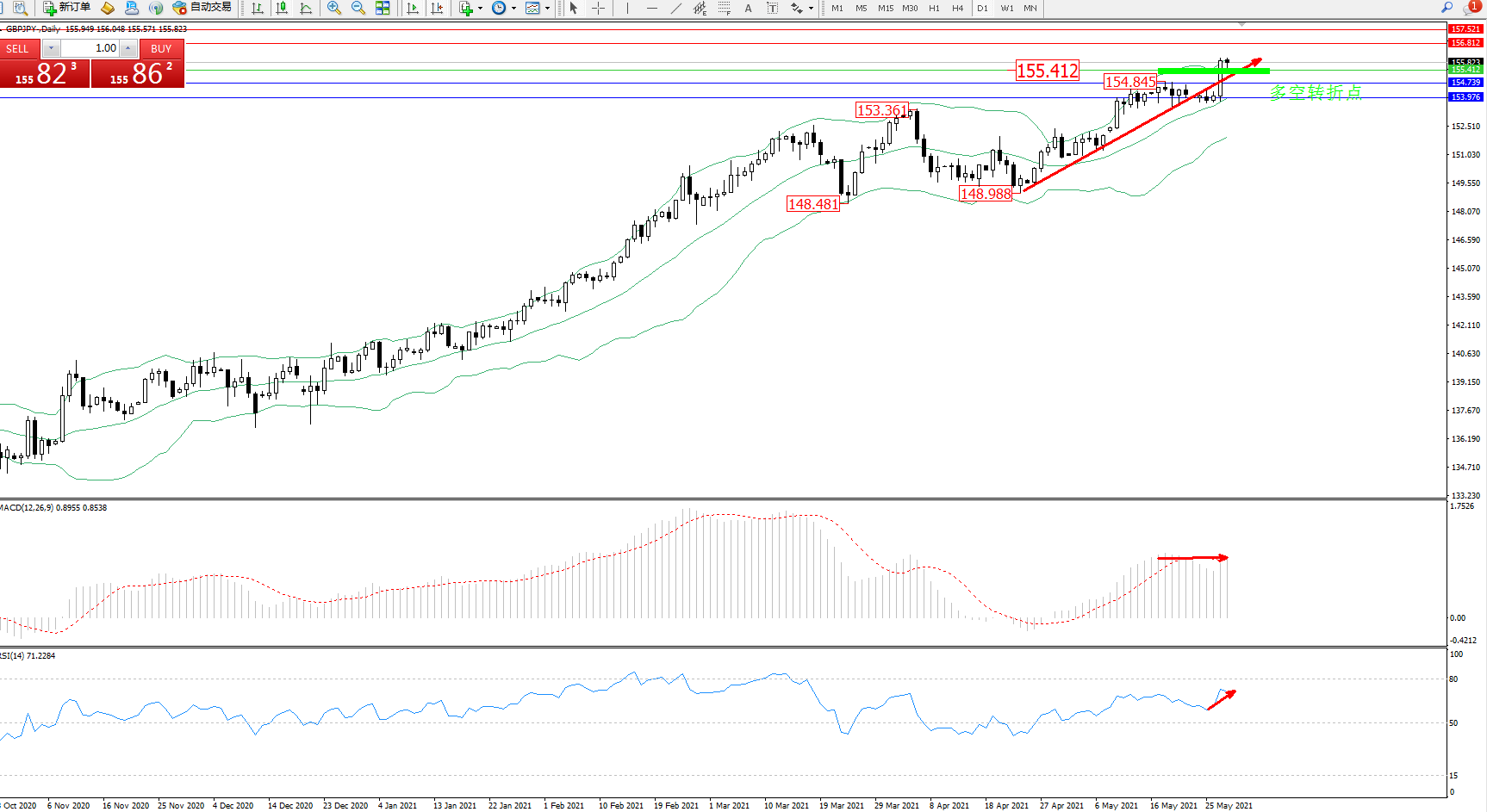 技术点评:多头动力延续布林带指标通道中上轨区间持续震荡上移,高位抵达154.845位置附近遇阻整理回撤,触及中轨附近节点后强势飙升是上轨附近节点,有继续向上移动态势,关注上轨附近节点,布林带指标高位有再度张口迹象,呈张口走势后有短暂收口迹象,MACD指标处于多头区域弱势整理徘徊中,RSI指标处于多头区域高位平缓下移后强势拉升;