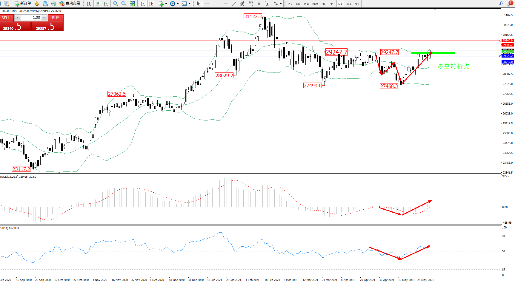 技术点评:空头动力震荡下行至27468位置后,低位多头动力震荡上扬,触及布林带指标上轨附近节点后开始短暂震荡,短期仍有破位上移迹象,布林带指标呈收口平移走势后开始有张口迹象,关注上轨附近节点,MACD指标处于0轴线上方多头区域弱势震荡回升,RSI指标低位多头动力持续震荡上移至50均衡线附近后继续拉升上行中;