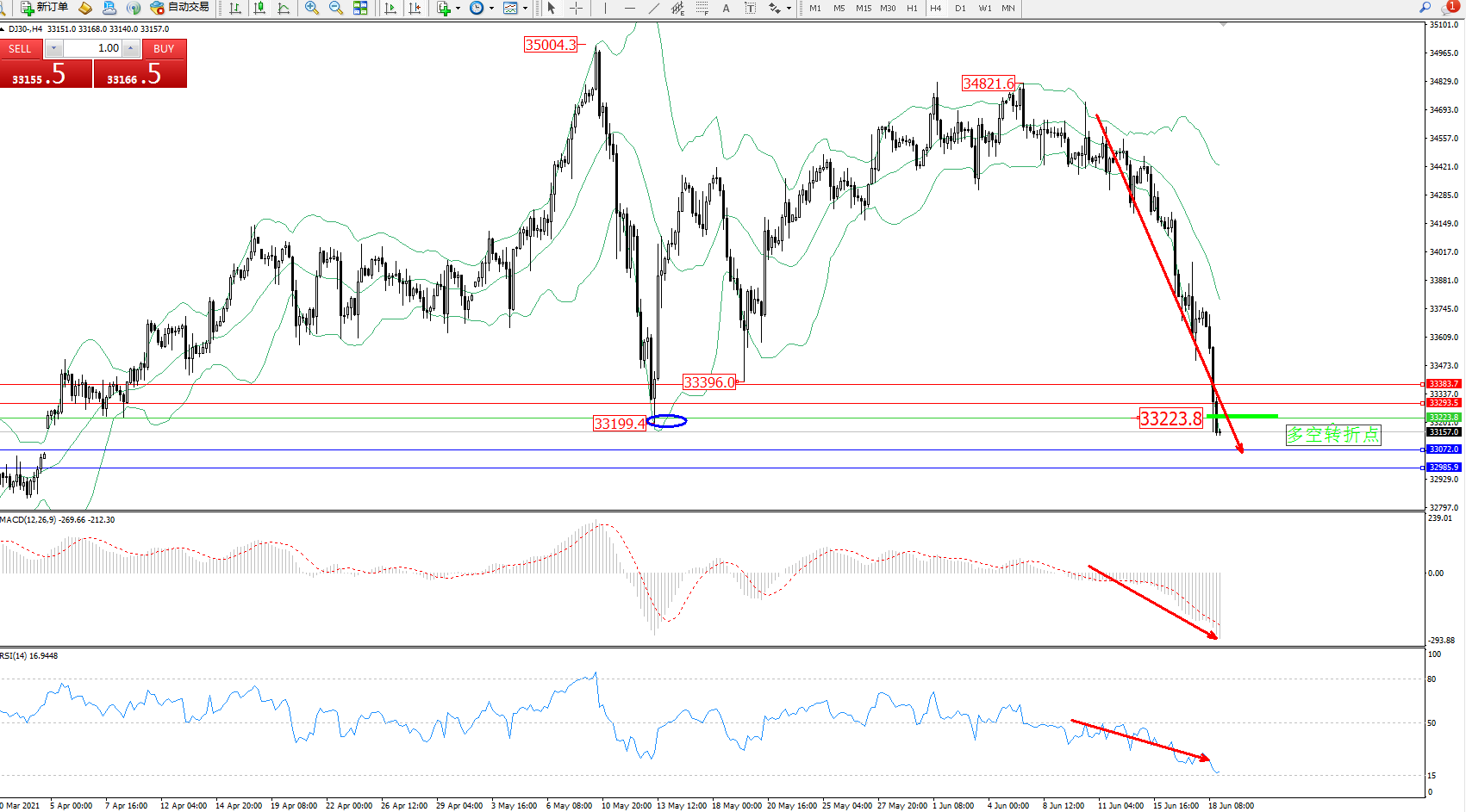 技术点评:空头动力延续布林带指标下轨附近强势下挫,跌势未见止步迹象,布林带指标呈下行趋势走势态势良好,前期低位33199位置已然破位,空头动力强劲,MACD指标处于0轴线下方空头区域维持震荡不断下移中,RSI指标处于50均衡线下方空头区域维持震荡不断下移中,即将触及超卖区15均衡线附近节点;