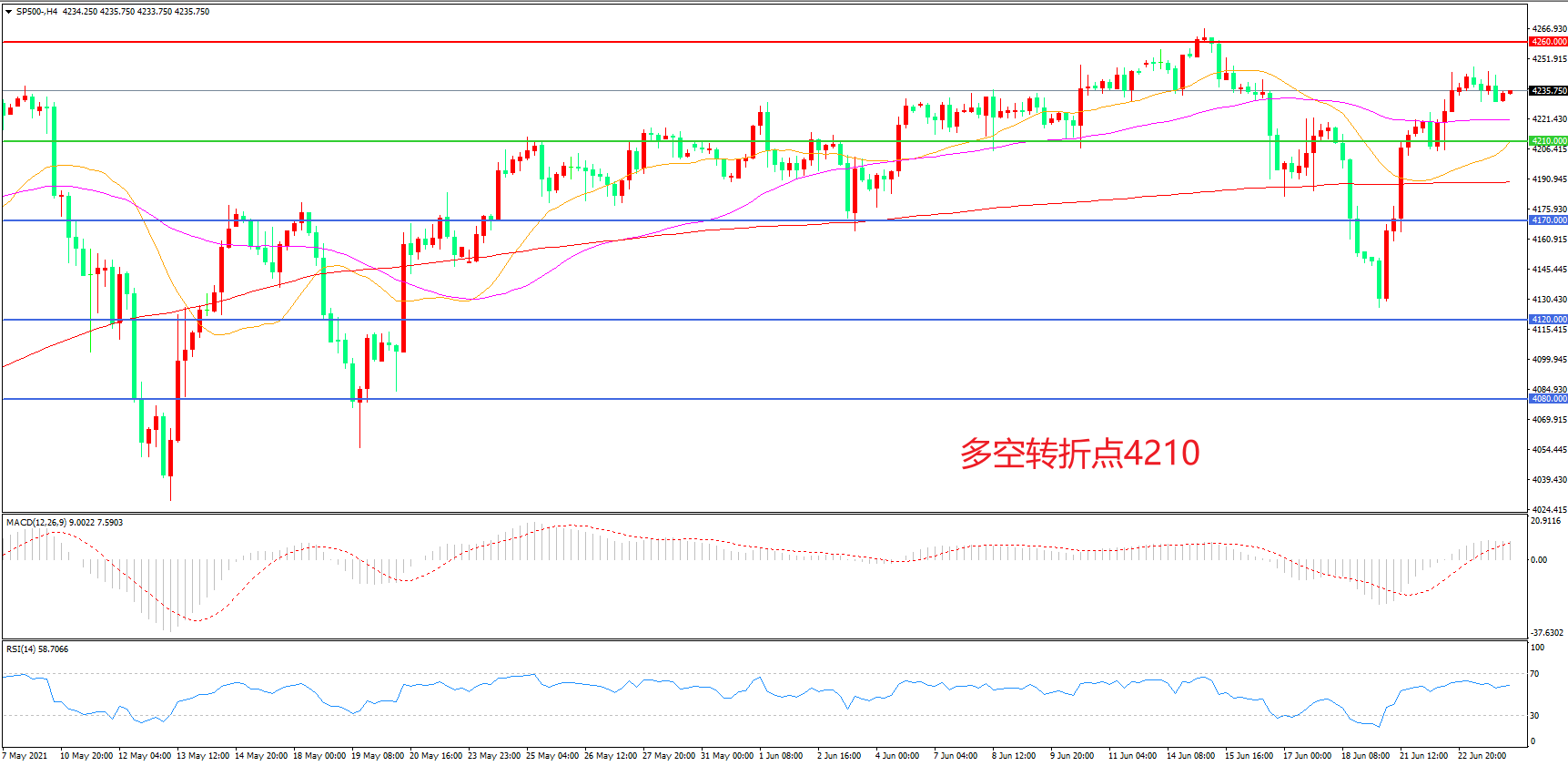 4小时图看,标普500回踩4210后延续高位震荡,短期表现有所回暖,55周期均线走平,MACD红柱增加,RSI指标走平,日内震荡上行概率较大。