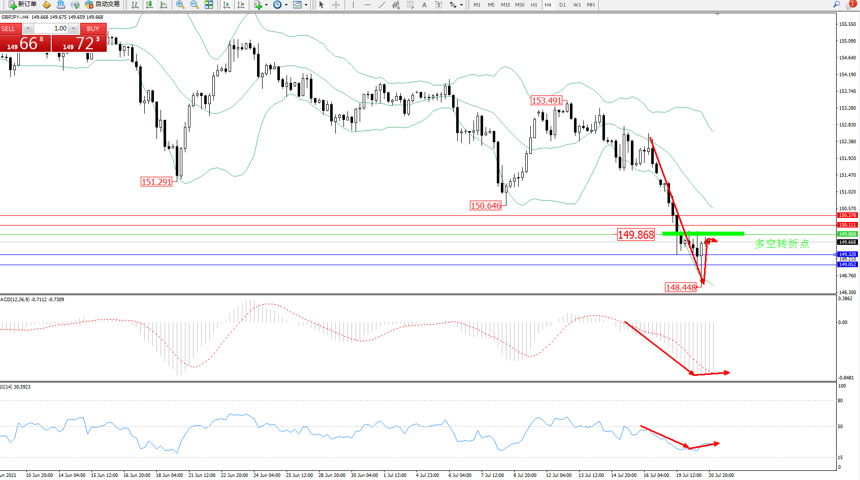 空头动力延续布林带指标下轨附近持续震荡下行,低位抵达148.448附近后开始快速回升整理,空头下行趋势或将持续,布林带指标呈张口走势持续中,MACD指标处于空头区域向下移动后开始徘徊,RSI指标处于50均衡线下方空头区域维持整理;