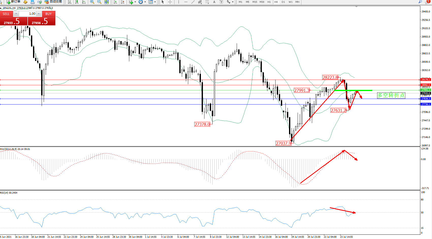 技术点评:低位多头动力延续布林带指标通道中上轨区间持续震荡上扬,高位抵达28223位置附近遇阻回撤,急速触及下轨27631位置节点后快速回升,纠结于中下轨区间震荡,短暂有即将触及中轨附近节点迹象,布林带指标呈上行趋势后开始收口转向下移动迹象,MACD指标处于多头区域拉升后反转下移,即将触及0轴线附近节点,RSI指标纠结于50均衡线下侧附近持续震荡徘徊中;