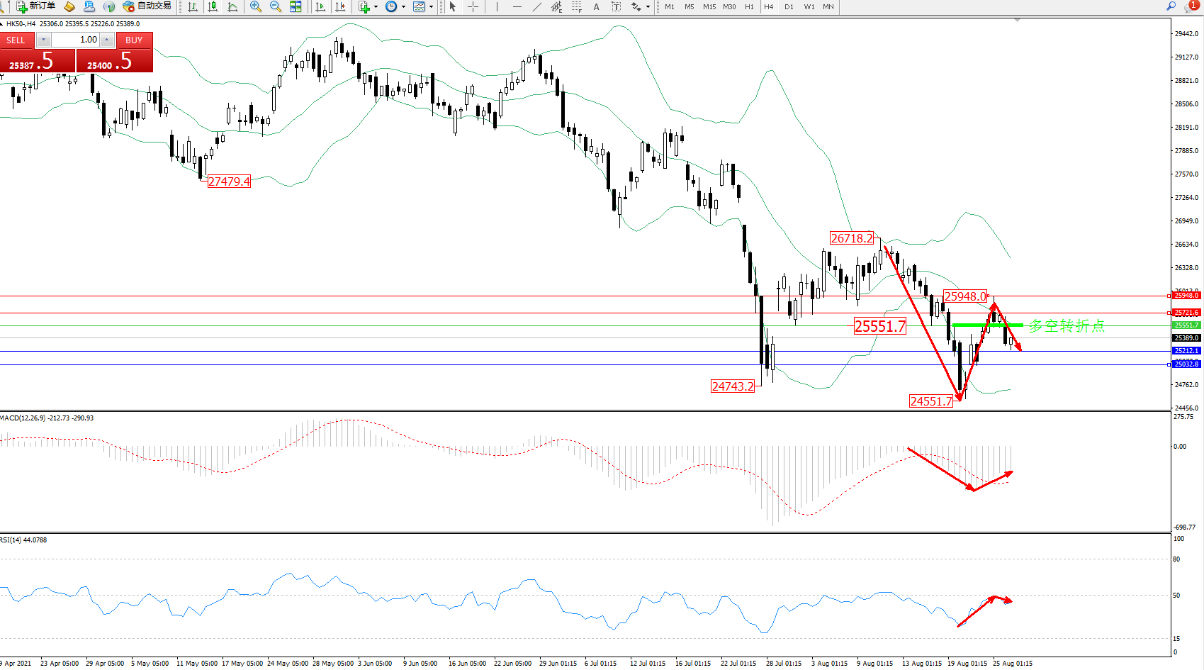 香港恒生指数8月26日(周四)收盘下跌278.26点,跌幅1.08%,报25415.69点;港股三大指数大幅收跌,恒生科技指数跌1.89%报6337点。大型科网股依旧为市场晴雨表,快手大跌超9%,小米跌3.55%,阿里巴巴、腾讯皆下跌,拖累大市情绪低迷;恒大概念股延续跌势,恒大汽车大跌超18%,医药股、苹果概念股、汽车股全天表现低迷,瑞声绩后大跌10%领跌恒指成份股;教育股、内房股、电信股、建材水泥股等齐跌。今日大市成交额为1385亿港元,南下资金净流出11.79亿港元。