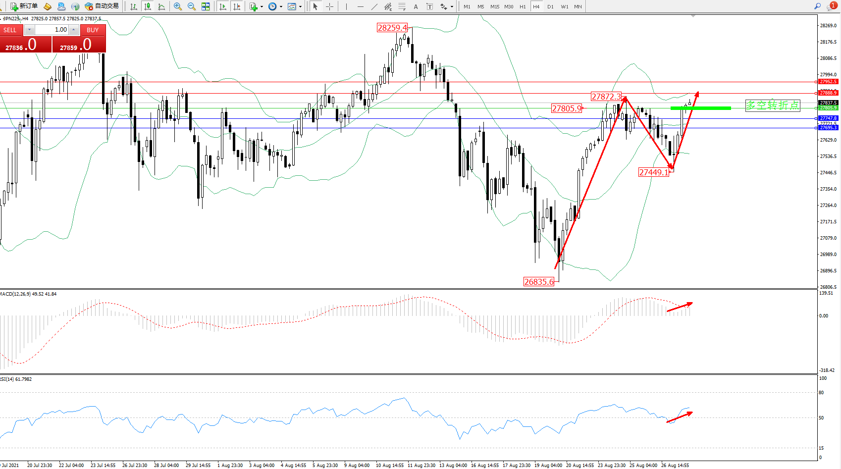 技术点评:多头动力强势拉升后出现急速震荡回撤,维持在高位宽幅震荡中,多头力度再度拉升,处于布林带指标中上轨区间震荡,布林带指标呈收口平移后有张口迹象,MACD指标处于0轴线上方多头区域维持窄幅整理,RSI指标处于50均衡线震荡后不断上移中;