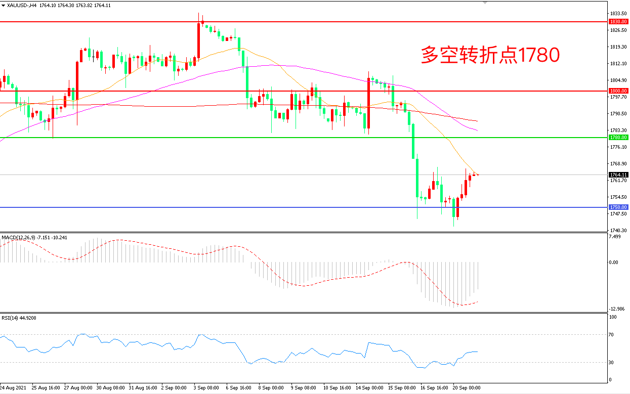 4小时图看,金价长阴连续下破,短期走势极度低迷,均线系统呈空头排列, 1750成为下方支撑,MACD绿柱增加,RSI指标走平,日内震荡下行概率较大。
