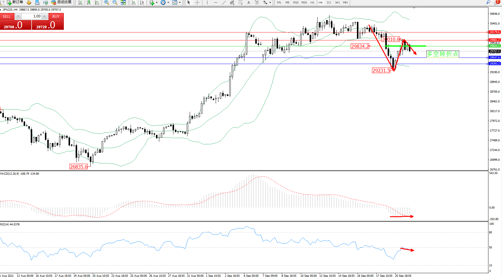 日经225指数9月21日(周二)收盘下跌659.55点,跌幅2.16%,报29840.50点。市场前瞻日本央行利率决议:维持政策不变,日本疲软的通胀前景强化了我们的观点,即日本央行仍不会收紧政策,并将在未来数年维持大规模刺激措施,至少到2023财年。市场相信,日本央行在正常化方面已经走到了尽头,在黑田东彦2023年4月离任之前,政策都将保持不变。