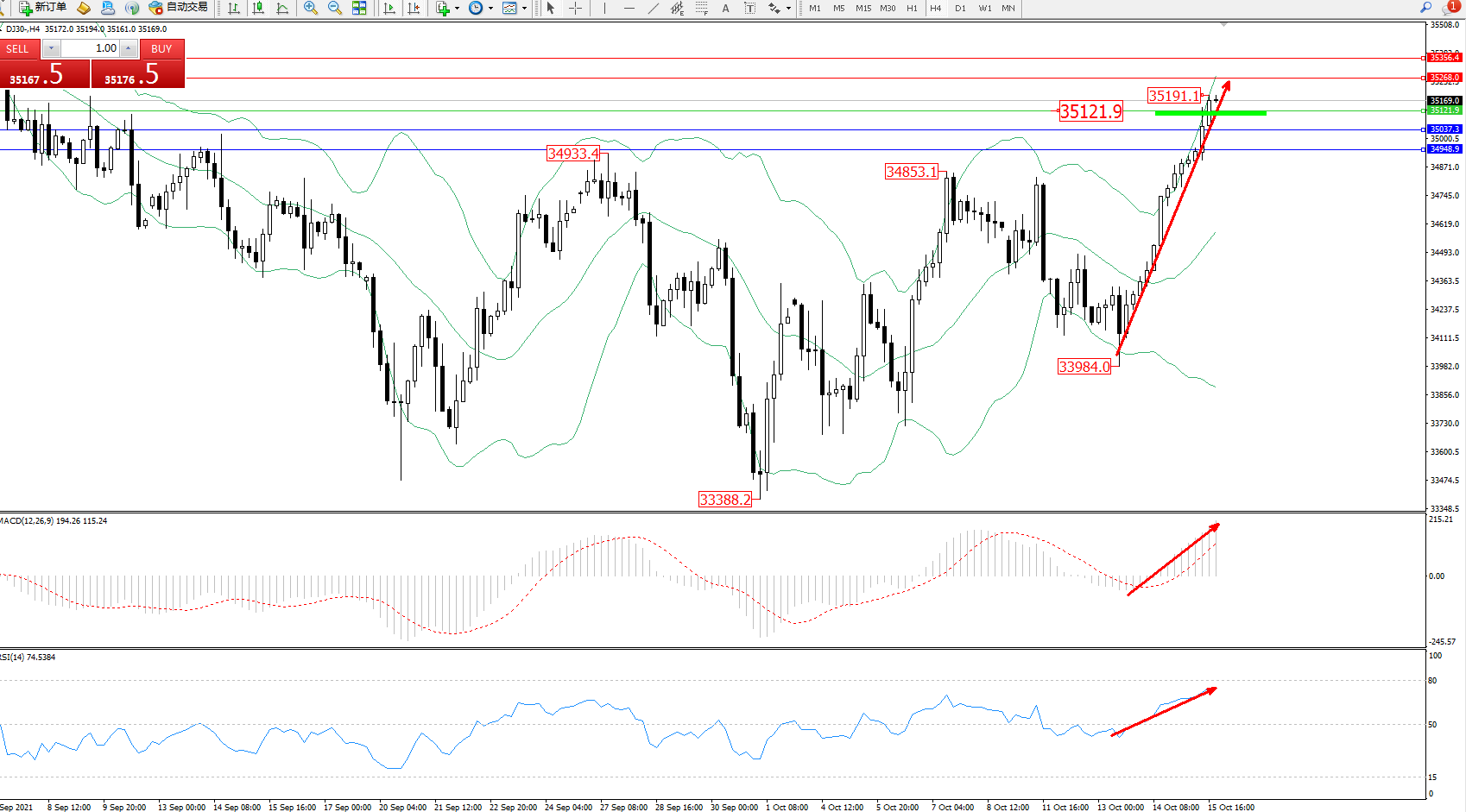 道琼斯指数10月15日(周五)收盘上涨382.92点,涨幅1.10%,报35295.48点;美国股市创下7月以来最大周涨幅,企业盈利强劲和零售销售意外增长提振了那些更可能从经济反弹中受益的公司股价。密歇根大学10月初消费者信心指数创十年来倒数第二低,但这似乎没有对股市产生影响。零售、银行、工业板块领涨标普500指数。金融,工业,能源、材料等周期性股票有望进一步上涨,公用事业和消费必需品板块将面临利率和通胀上升带来的阻力。