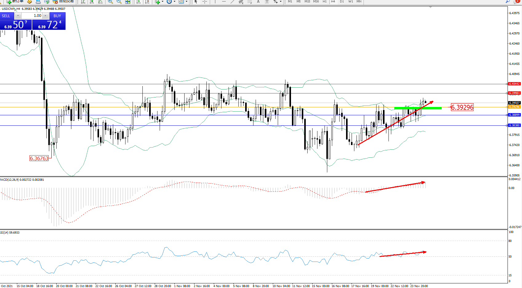 交易策略:6.39296上方看涨,目标6.39963、6.40442