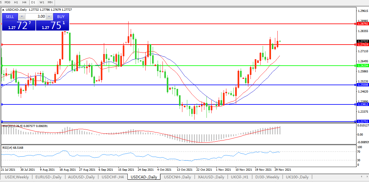 美元兑加元涨0.30%至1.2779;加元兑美元11月下跌约3%,创出2020年3月以来最差单月表现。