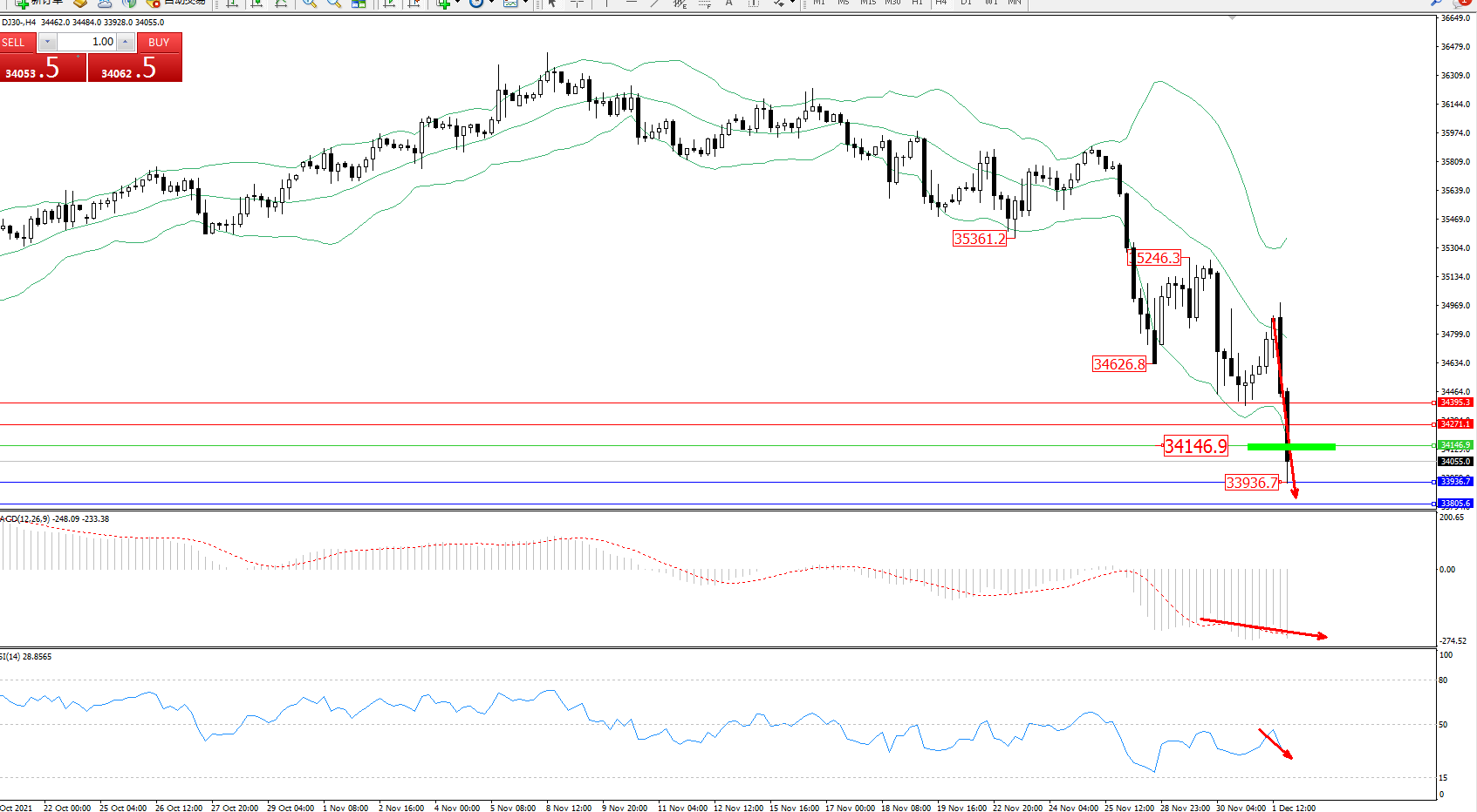 道琼斯指数12月1日(周三)收盘下跌462.11点,跌幅1.34%,报34021.61点;美股高开低走,尾盘加速下挫,小非农11月ADP就业数据表现略超预期,奥密克戎变异病毒来袭,新冠肺炎疫情正在重塑美国劳动力市场。美联储主席鲍威尔称,奥密克戎变异毒株和近期新冠病例的增加对美国经济构成了威胁,并增加了通胀前景的不确定性。