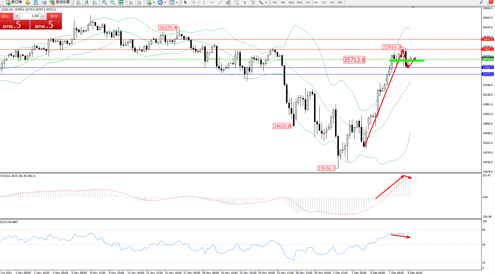 技术点评:多头动力延续布林带指标上轨附近持续震荡上扬,高位抵达35919位置节点后开始震荡,短期或维持高位巨震,布林带指标呈张口走势后开始收口,MACD指标处于多头区域维持整理不断上移后开始平移,RSI指标处于多头区域维持整理平移后开始整理;