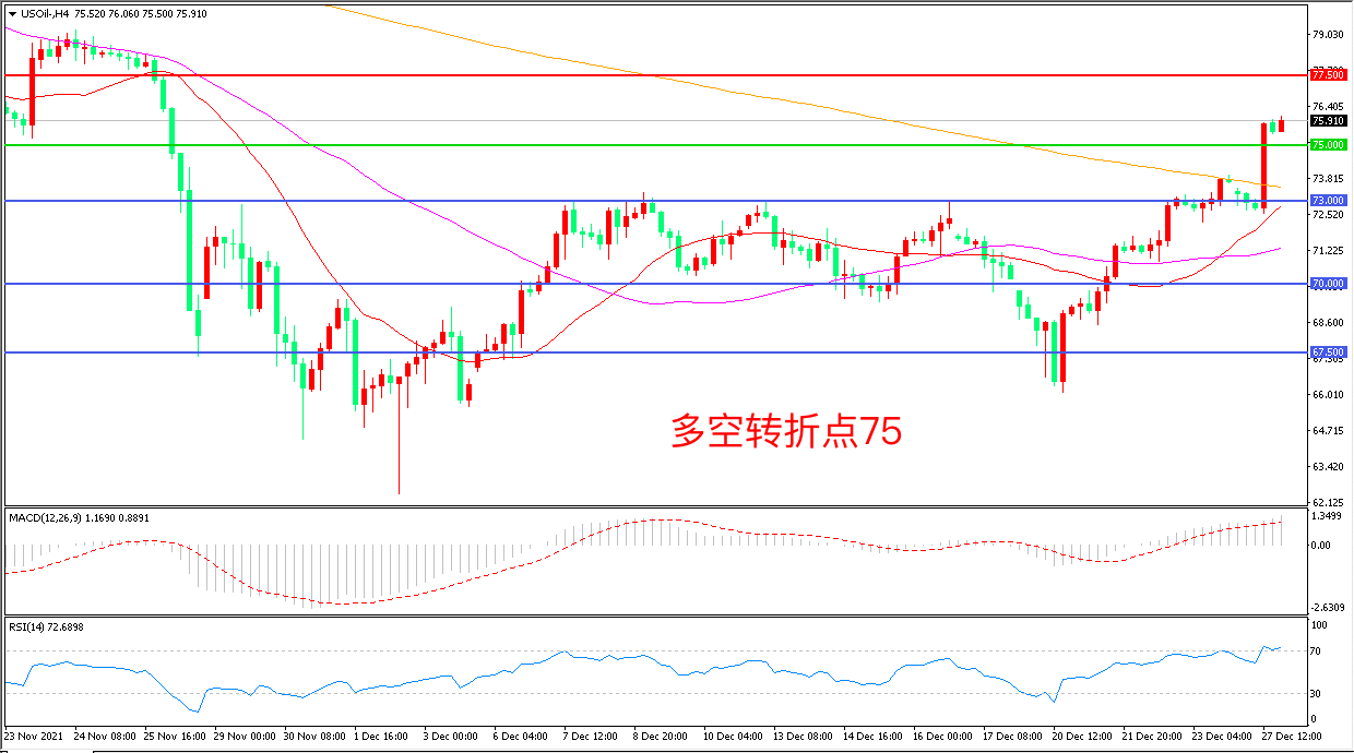 交易策略:在75.00之上看涨,目标77.50 80.00