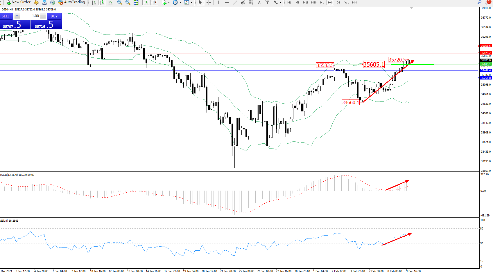 交易策略:35605上方看涨,目标35879、36059
