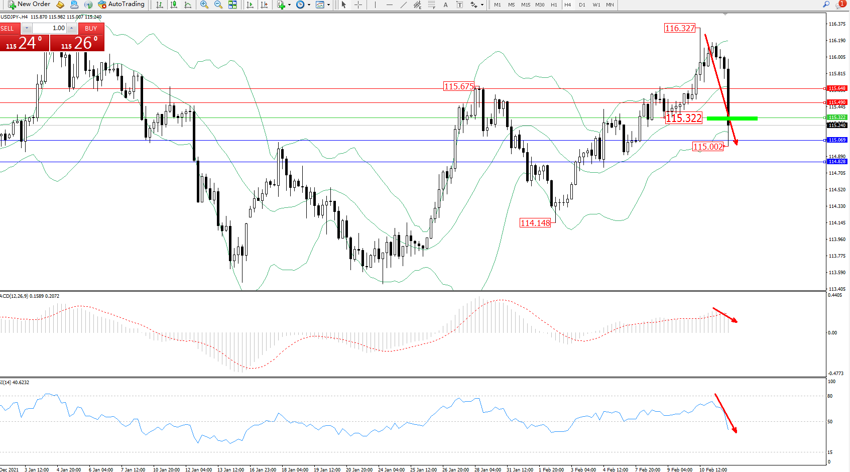 技术点评:多头动力延续布林带指标通道中上轨区间持续震荡上扬,高位抵达116.327附近遇阻回撤,短期整理后,空头动力伺机入场急速下挫,跌破布林带指标下轨至115.002附近整理,空头下行态势良好,高位下行趋势或价格持续,布林带指标高位呈收口走势中,MACD指标处于多头区域维持整理上移后开始缓慢下行,RSI指标处于多头区域维持震荡急速下挫至50均衡线下侧震荡;