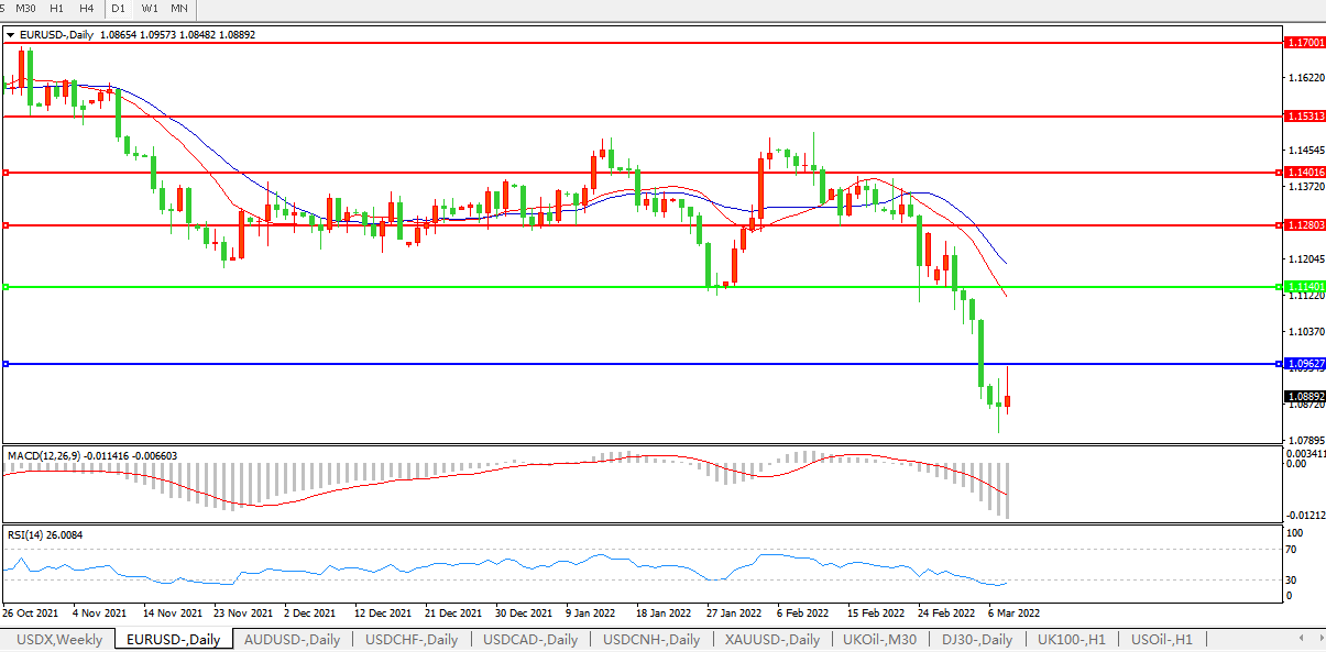 技术面简析:日图均线呈空头排列,汇价小幅反弹,MACD运行于0轴下方且量能0轴下持续放量,RSI小幅反弹,预计短期汇价大概率将在反弹后进一步下行。
