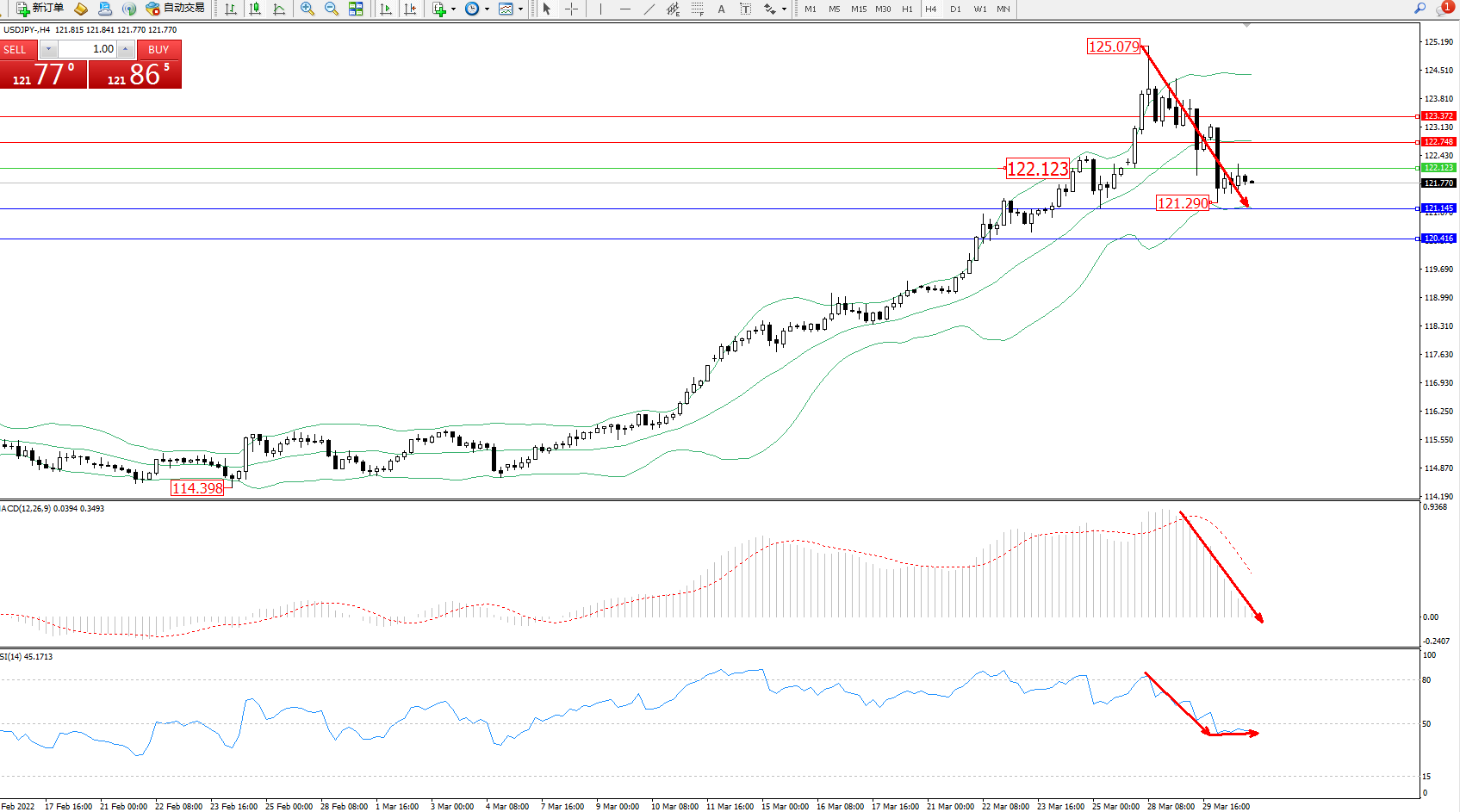 交易策略:122.123下方看跌,目标121.145、120.416
