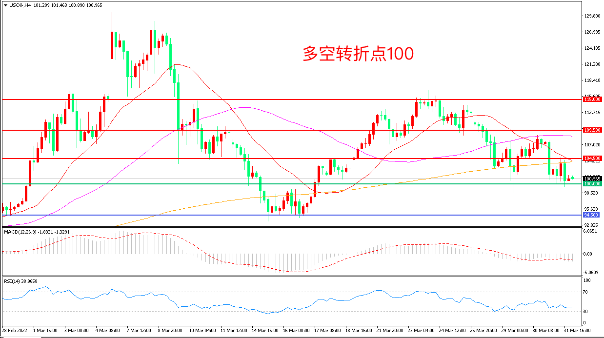4小时图看,油价触碰21周期均线后再度回落,短线走势低迷,104.5成为上方阻力,100美元成为多空分水岭,MACD绿柱缩短,RSI指标走平,日内延续震荡概率较大。