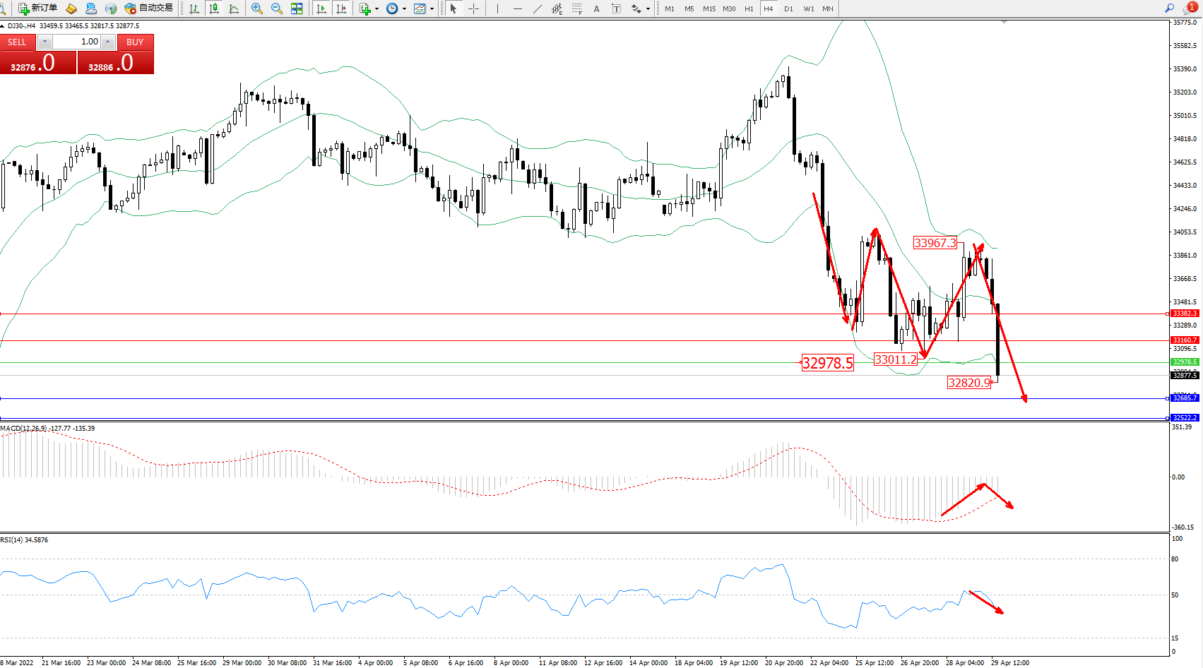 交易策略:32978下方看跌,目标32685、32522
