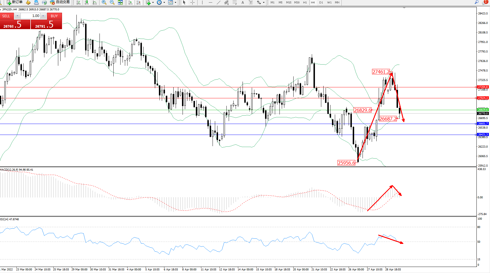 技术点评:低位多头动力强势拉升上扬,高位延续布林带指标上轨上行至27461附近节点遇阻回撤,抵达中轨26687附近节点后整理,短期高位空头动力急速下挫,布林带指标呈张口走势持续后开始有缓慢收口迹象,MACD指标处于多头区域维持震荡回撤中,RSI指标处于多头区域维持震荡下行至50均衡线附近徘徊;