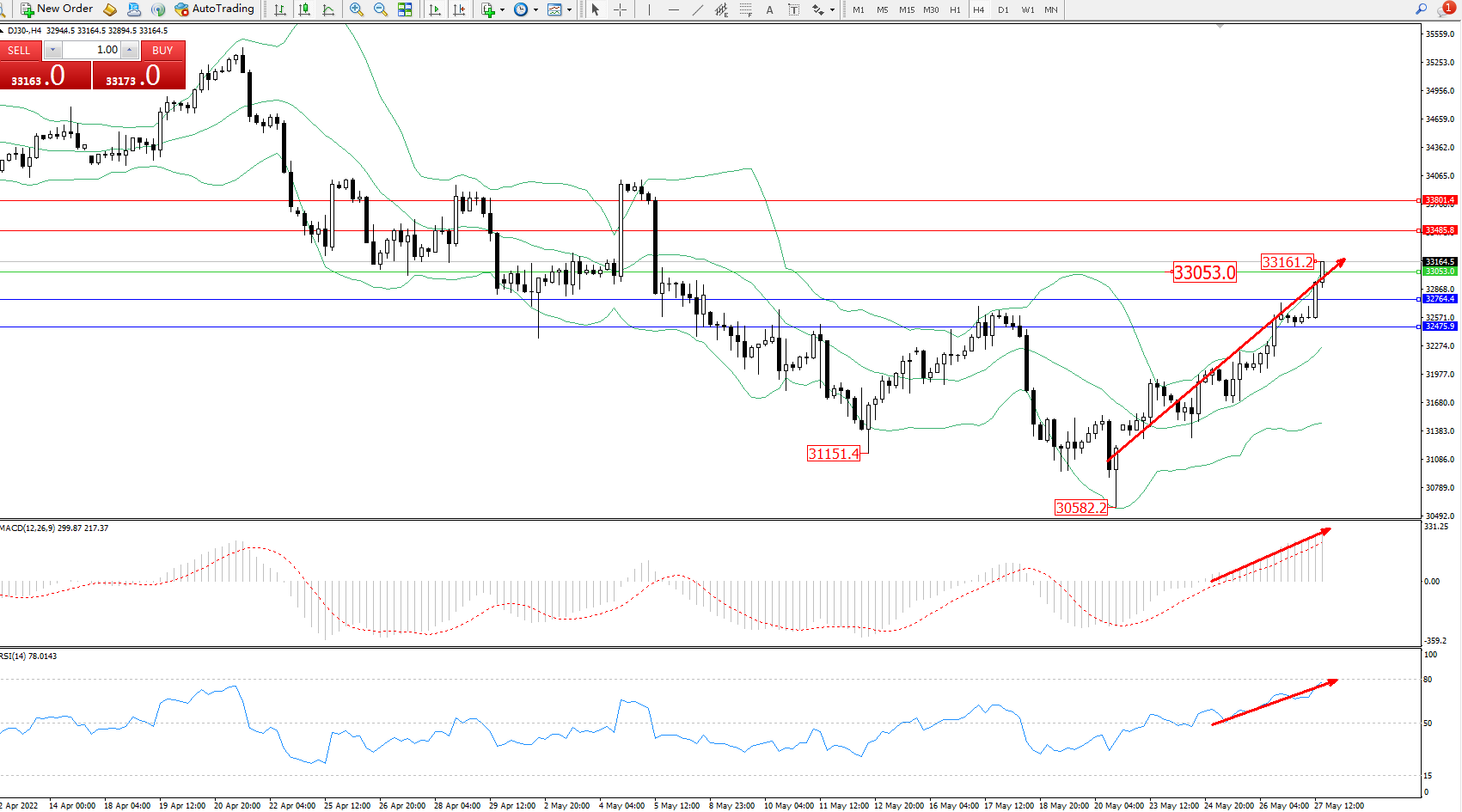 道琼斯指数5月27日(周五)收盘上涨576.36点,涨幅1.77%,报33213.55点;美股收盘,三大股指高收,道指初步收涨,数据显示通胀持续高压之际消费者的支出仍强劲,是企业利润前景的利好;PCE物价指数较3月增长有所放缓,虽仍接近四十年来增速高位,但市场猜测可能是通胀见顶迹象,美联储加息步伐有望稍缓,美元指数和美国债收益率回软,大型科技股、半导体股走强。