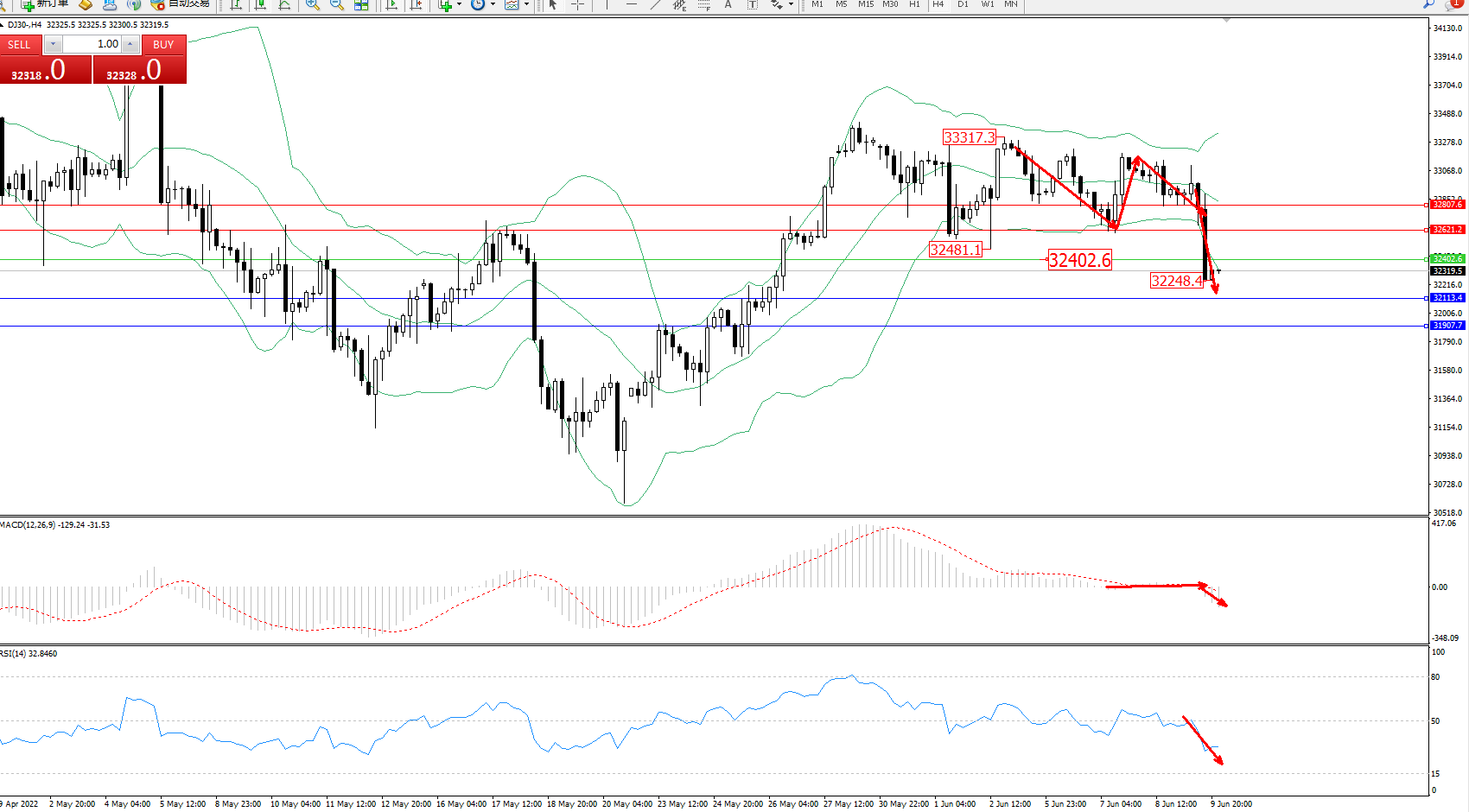 技术点评:长时间维持在布林带指标通道内窄幅震荡,波幅空间逐渐收窄,布林带指标呈张口走势持续中,低位跌破下轨至32248附近节点后整理,MACD指标处于0轴线附近整理后开始下行,RSI指标处于50均衡线下侧维持震荡下移;
