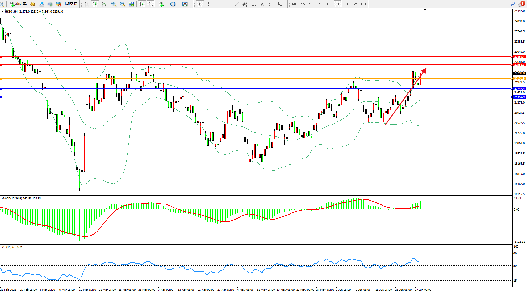 香港恒生指数6月28日(周二)收盘上涨189.45点,涨幅0.85%,报22418.97点;新冠隔离政策有所放宽,港股主要指数午后直线拉升转涨,恒生科技指数涨0.61%,三者均连涨4日且续刷反弹新高。在线教育股、手游股全天表现弱势,医美、元宇宙板块走低明显。今日南下资金净流入41.83亿港元,大市成交额为1759亿港元。