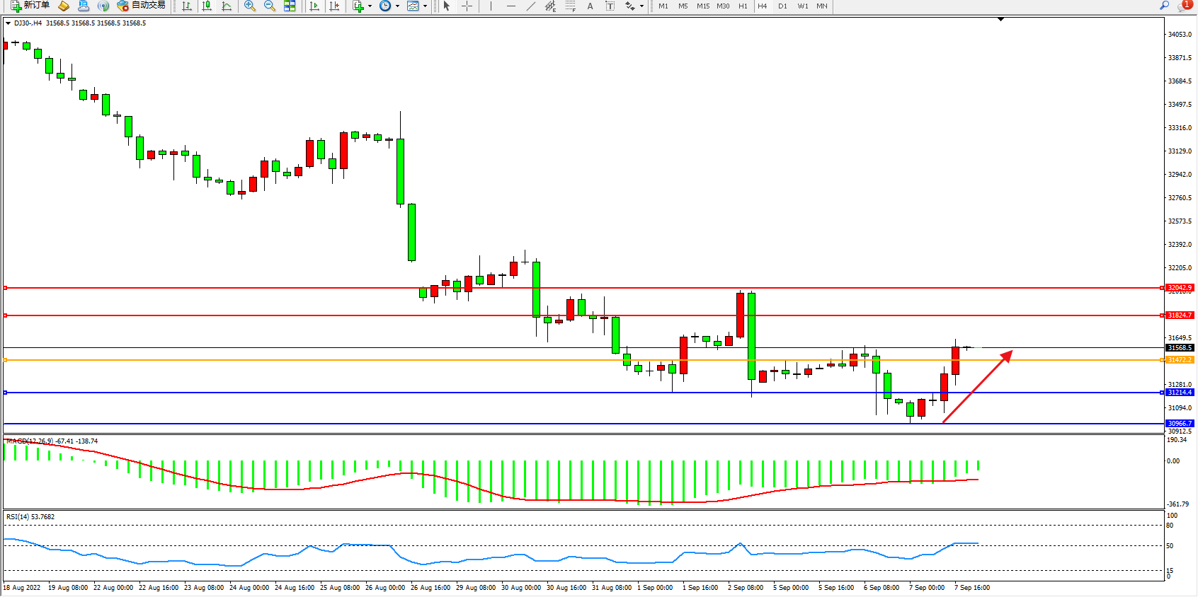 道琼斯指数9月7日(周三)收盘上涨435.98点,涨幅1.40%,报31581.28点;美联储鹰派的做法将意味着在即将召开的会议上加息75个基点,然后在接下来的两次会议上小幅加息。